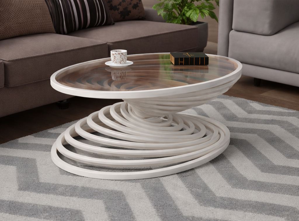 The Eclipse Oval Coffee Table by Krazy Cool is a statement piece designed for spaces that need more than just a surface. It brings together sculptural form, modern elegance, and the natural warmth of wood in a way that instantly draws the eye. With its flowing oval top and dramatic spiral base, this table feels less like ordinary furniture and more like functional art made for everyday living.