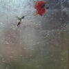At the heart of the composition, a vivid crimson hibiscus blooms delicately from the upper right, its organic curvature and botanical detail rendered with hyperrealist precision. Below it, a jewel-toned hummingbird hovers mid-flight, its iridescent plumage seeming to shimmer and shift as the silver backdrop catches the light from different angles. The negative space — soft, radiant, and tactile with delicate foil texturing — enhances the sense of tranquility, airiness, and elegance.
